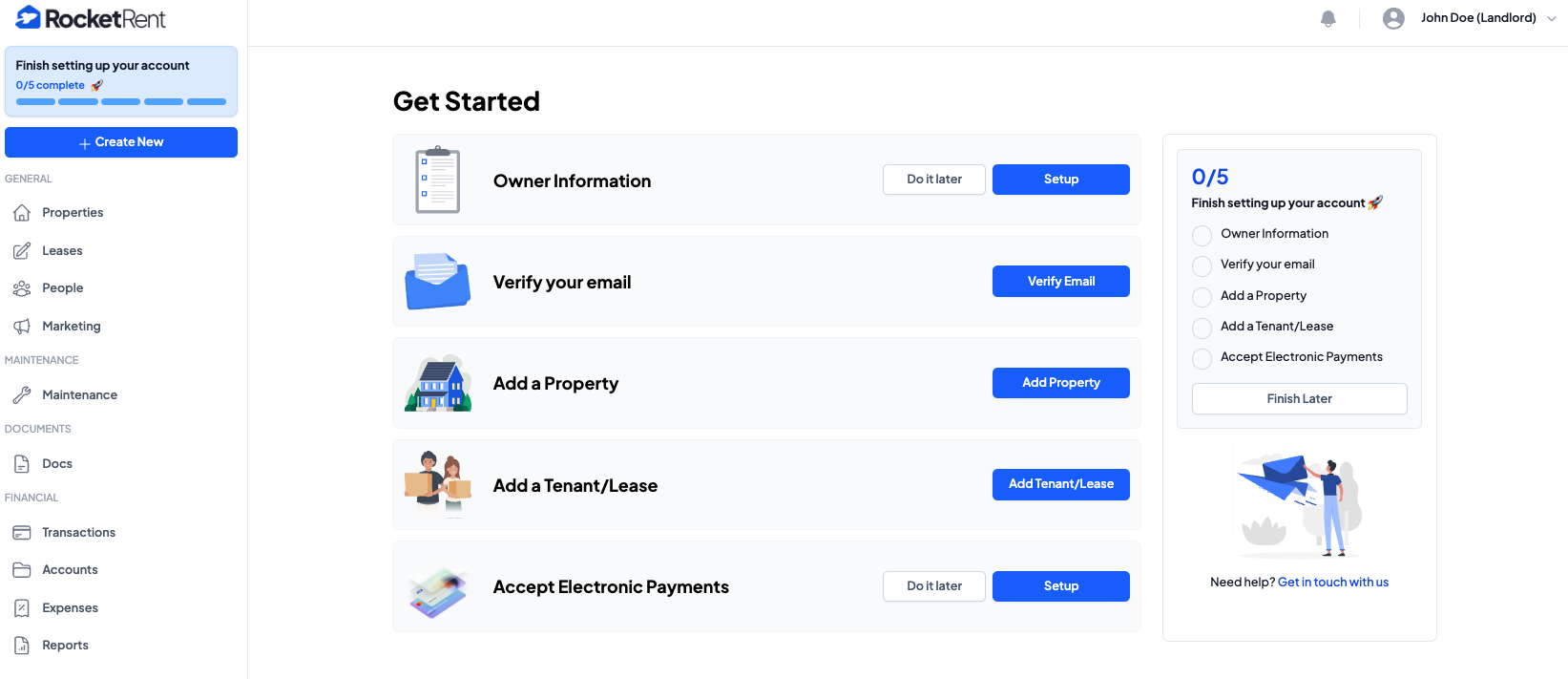 Once you register your RocketRent account, you will be able to finish setting up your dashboard in five (5) easy steps.