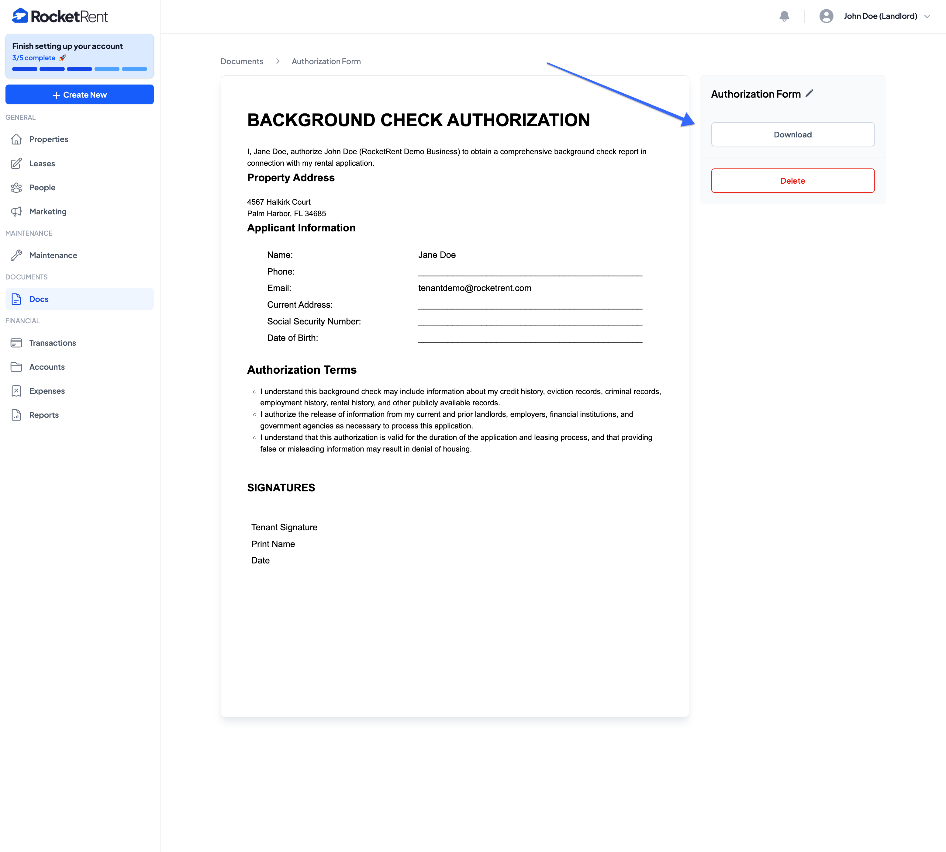 - Your landlord information will automatically populate in the template based on your registered information